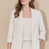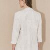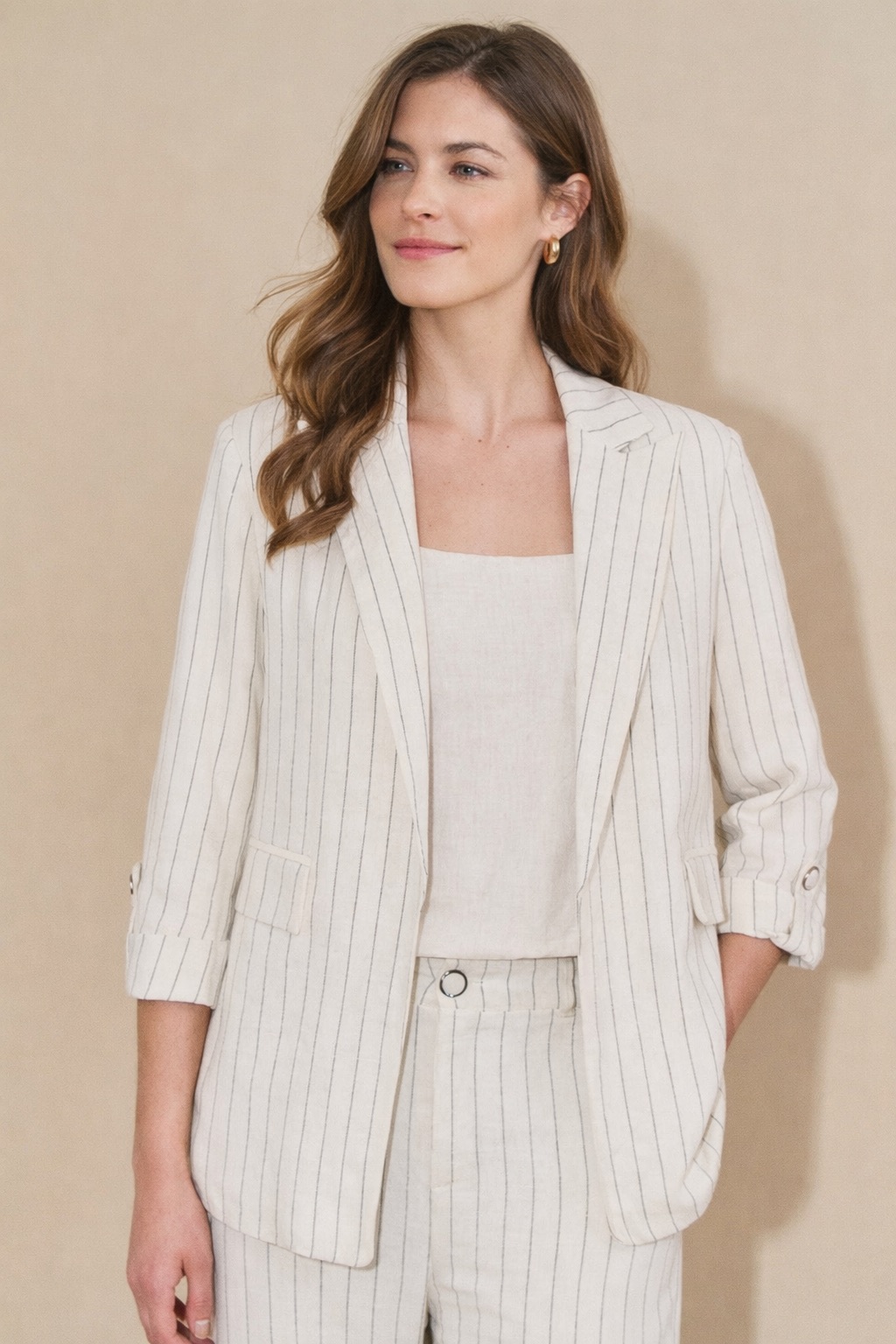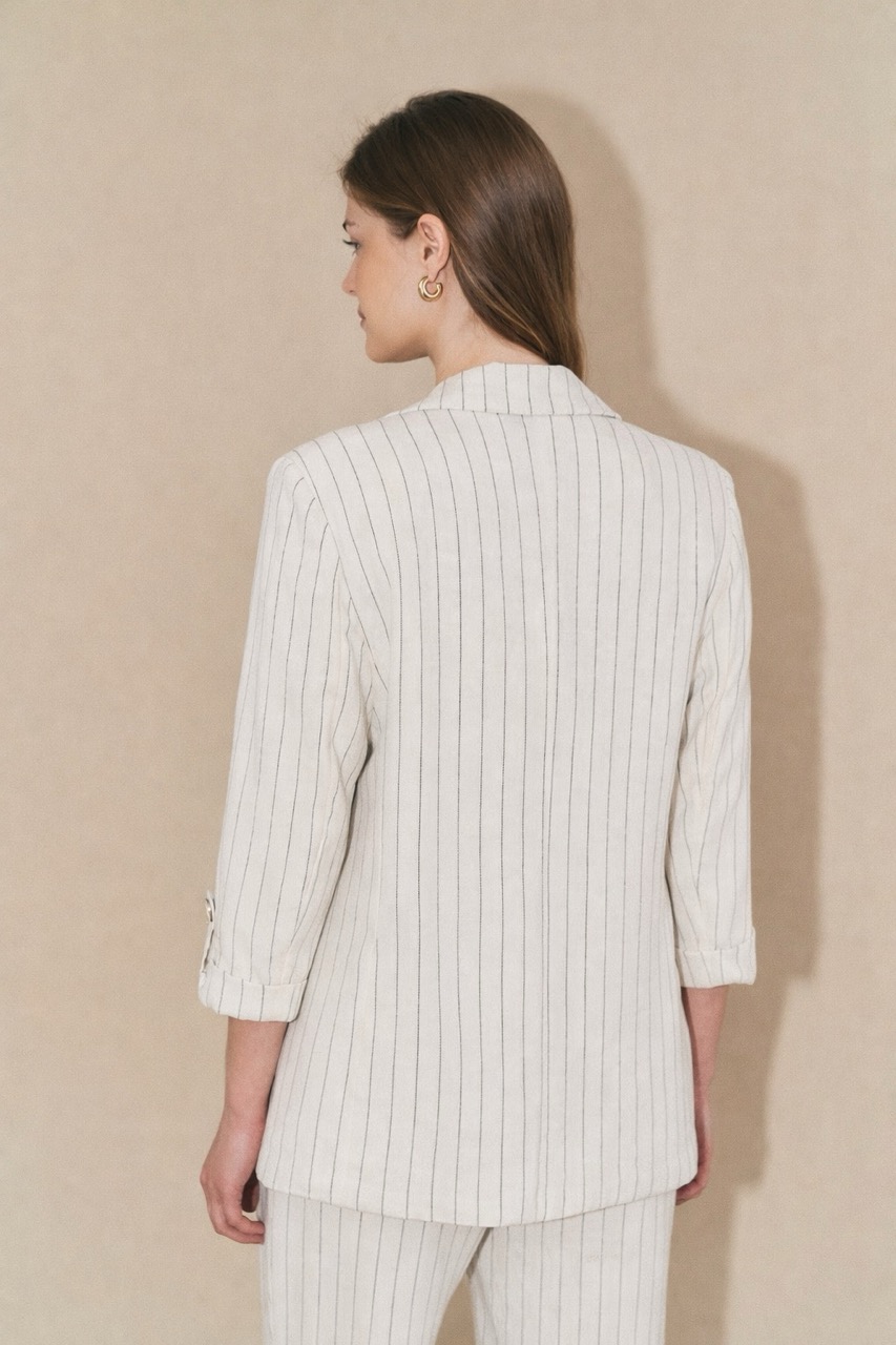 BLAZER RAYADO 50% VISCOSA, 50% LINO CON FORRERÍA. MANGA 3/4 Y BOTÓN REGULABLE DE LARGO. CON HOMBRERAS Y DOS BOLSILLOS EN EL FRENTE.