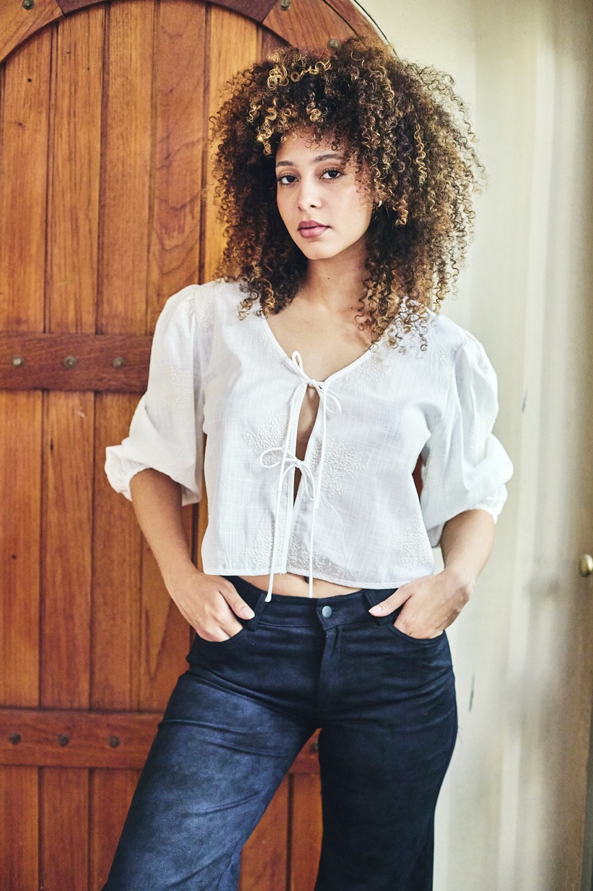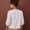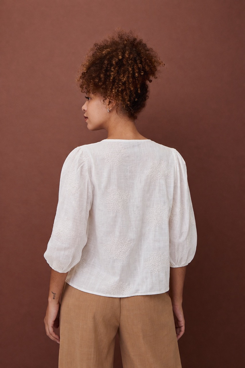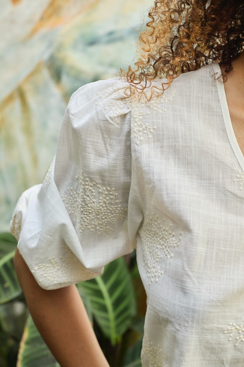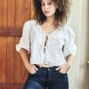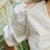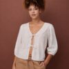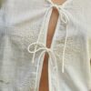 La Blusa Helena combina sutileza, frescura y diseño atemporal. Confeccionada en una tela liviana y translúcida, se destaca por su delicada textura bordada y su frente con lazos regulables que aportan un aire femenino y sofisticado.