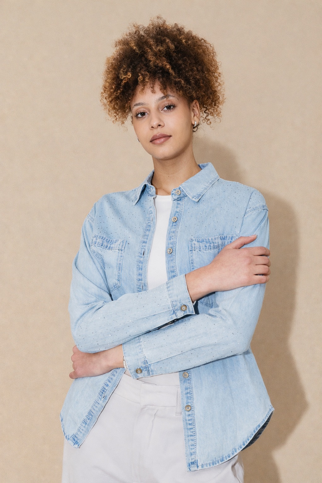 El detalle de hotfix en frente y mangas suma un brillo delicado y moderno, logrando un equilibrio perfecto entre básico atemporal y pieza protagonista. Presenta cuello clásico, cartera frontal con botones y bolsillo aplicado, ideal para llevar cerrada o abierta sobre tops y remeras.