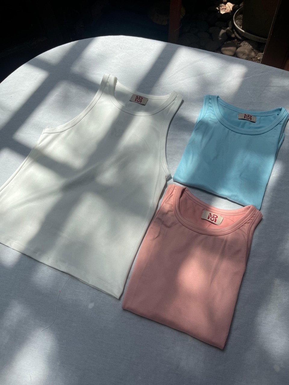 Incluye una musculosa blanca, una rosa y una celeste, ideales para looks frescos y luminosos.