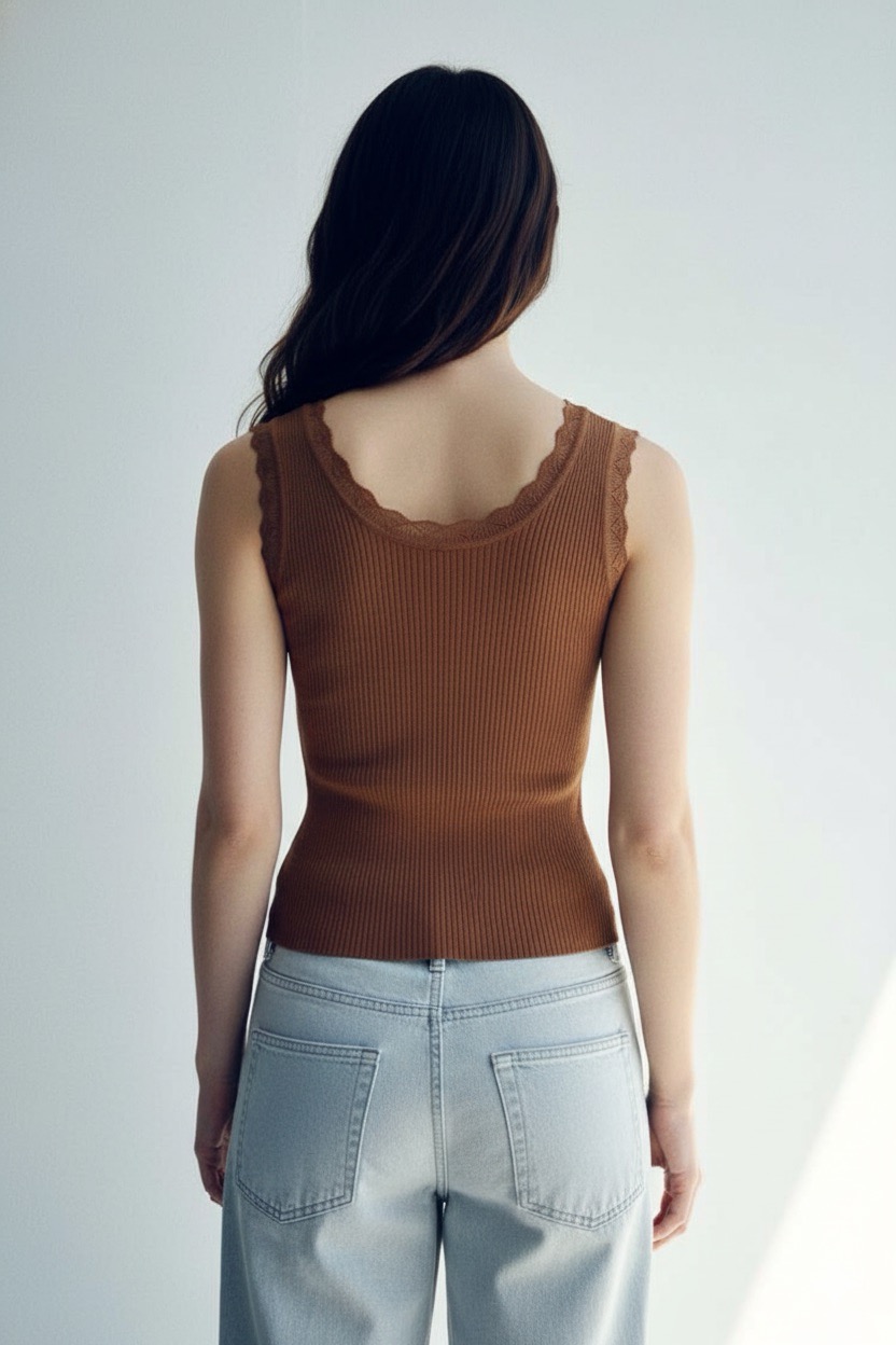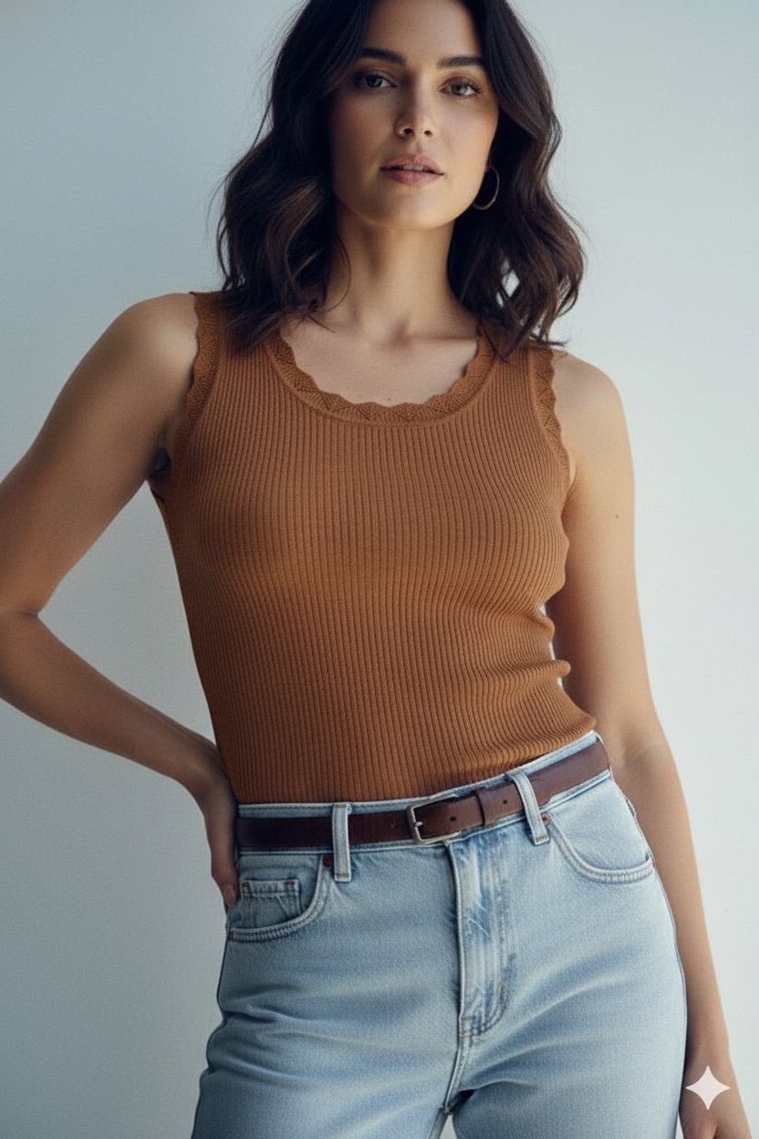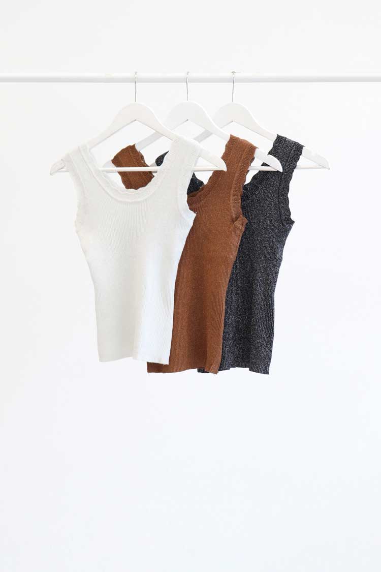 Musculosa tejida realizada en una mezcla de viscosa, poliamida y poliéster, que aporta suavidad, elasticidad y buena caída. Incorpora un detalle de hilo metalizado que suma un brillo delicado y moderno, elevando cualquier outfit sin perder comodidad. Su diseño la hace ideal tanto para looks casuales como para combinaciones más arregladas, perfecta para usar con jeans, pantalones sastreros o faldas.