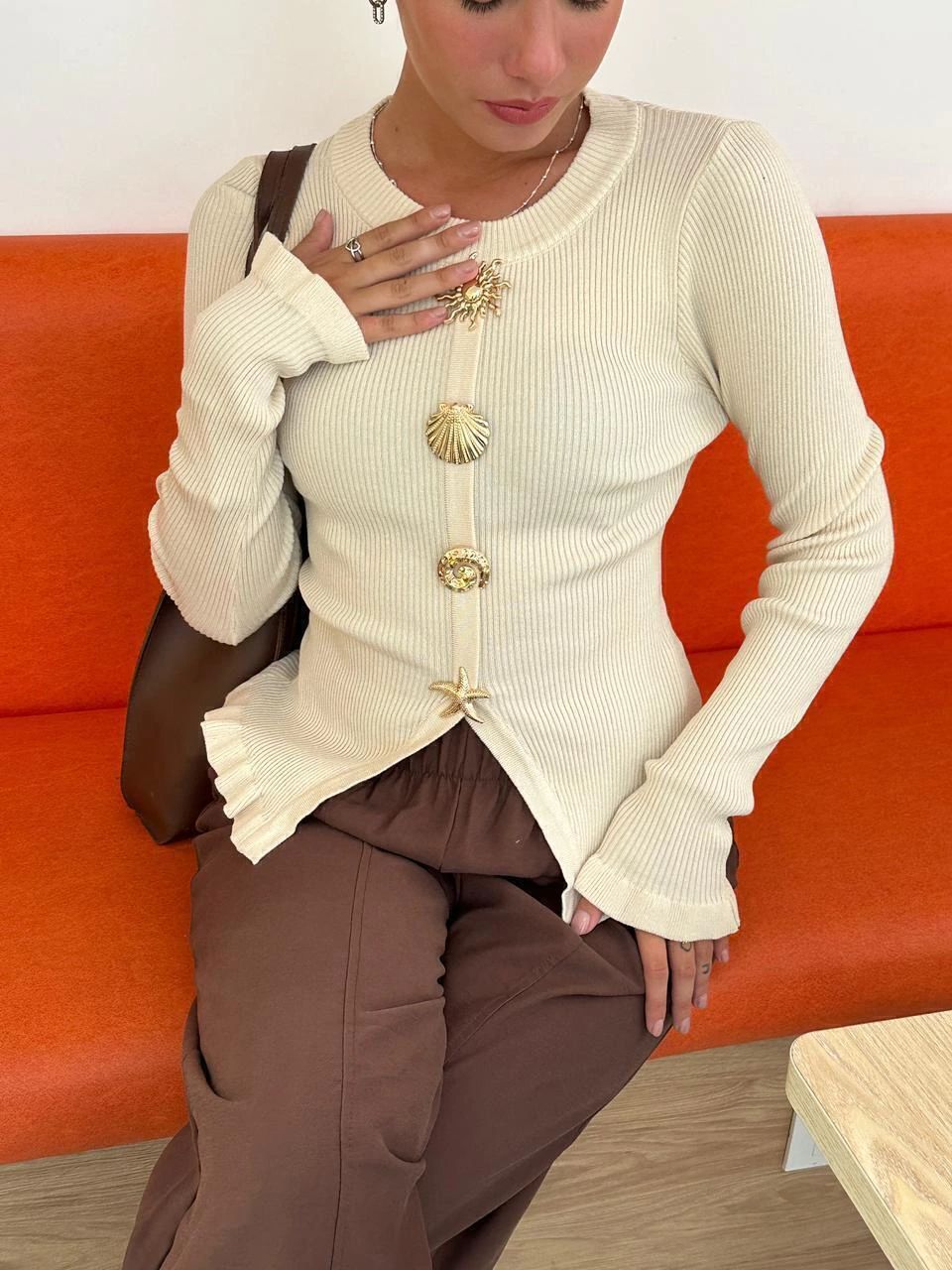 Presenta un diseño entallado de manga larga y cuello redondo, con abertura frontal sutil que estiliza la silueta. El detalle distintivo lo dan sus apliques dorados en el delantero, inspirados en formas orgánicas, que elevan la prenda y la convierten en el centro del look.